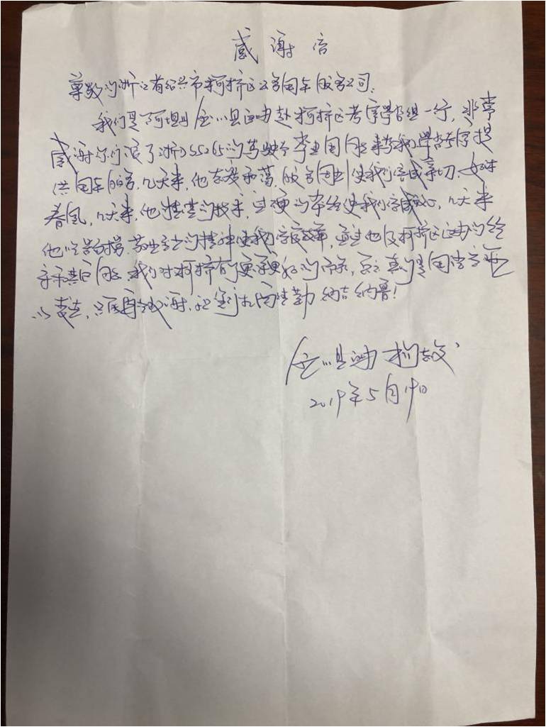 5月19日,區(qū)公車公司收到一封來自四川省阿壩州金川縣的感謝信。來信中,金川縣赴我區(qū)考察學習組一行由衷感謝了公司浙DS5265車的駕駛員李建國同志在履行出車任務期間待人和藹、愛崗敬業(yè),以精湛的駕駛技術和吃苦耐勞的工作態(tài)度,使考察組一行倍感親切、如沐春風,提高了考察組一行的辦事效率,對我區(qū)有了更深更好的認識,并送出無恙族祝福語:納吉納魯。