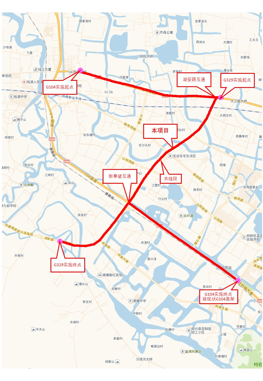 本項(xiàng)目錢陶線-輕紡城大道高架段(104高架)起點(diǎn)位于錢清鎮(zhèn)顧家蕩村上跨329國(guó)道,向東南沿329國(guó)道(錢陶線)向東經(jīng)新甸變電所、跨越東小江后,至杭金衢高速紹興連接線(湖安路)交叉口后折向南方,下穿杭甬高鐵,之后再次上跨東小江,經(jīng)過(guò)新農(nóng)農(nóng)副產(chǎn)品批零市場(chǎng)東側(cè),第三次跨越東小江,上跨杭紹城際鐵路,在秦望互通處,高架偏至杭金衢高速紹興連接線東側(cè),并上跨蕭紹運(yùn)河、秦望互通,后折向東,沿104國(guó)道至終點(diǎn),與現(xiàn)狀104國(guó)道柯橋段高架相接,路線全長(zhǎng)11.362km。